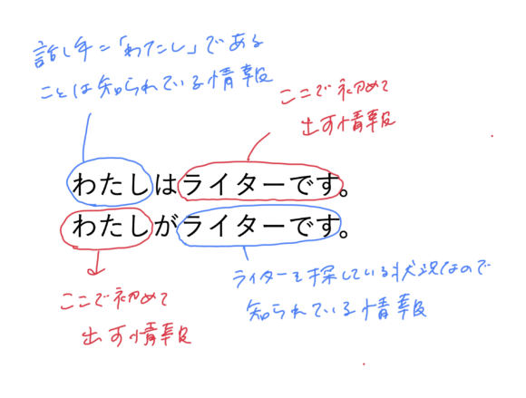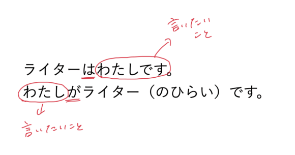 たしかに! たとえばライターとして取材に行ったとき、自己紹介する場面であれば「(わたしは)ライターのひらいです。よろしくお願いします」と言うのに対し、カメラマンや編集者などさまざまな職種の人が複数人いるなかで、誰かがライターを探している場面なら「わたしがライターのひらいです」と言うだろう。そこで「わたしはライターのひらいです」と言ったなら、(なんかこいつ急に自己紹介してきたな)となるに違いない。もし「は」でつなぐなら「ライターはわたしです」と答えれば自然だ。先ほどの法則にあてはめると、強調したい部分は誰がライターなのか? ということなので、きちんと一致している。