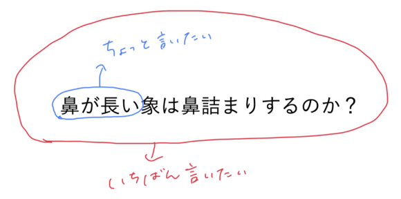 「象は鼻は長い」は、象が長いのか鼻が長いのかよくわからないし、「象が鼻が長い」は日常ではおそらく一度も耳にすることのない、めちゃめちゃな文章になっている。「象は鼻が長い」の一番伝えたいことはなにかと言えば、「鼻が長い」だ。その次に伝えたいことは「長い」だ。つまり、「は」と「が」が一文の中で使われるとき、一番伝えたいおおきなことは「は」に包まれ、そのなかで次に言いたいことは「が」に包まれているんじゃないか。もう少しわかりやすい別の例文で考えてみることにしよう。