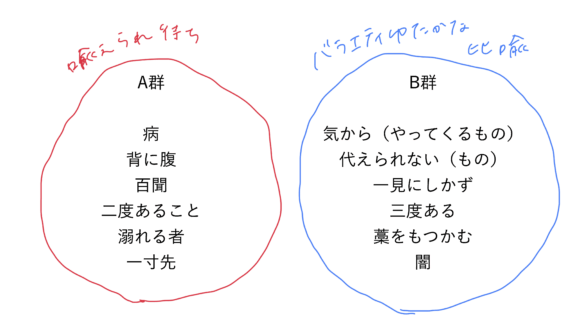 このイコールとは、主語が述語の言い換えになっているということだ。ほかの「時は金なり」「溺れる者は藁をもつかむ」「一寸先は闇」なども、イコールでつなぐことができる。主語をA群、述語をB群とすると、AをBに喩えている構造になっているのだ。