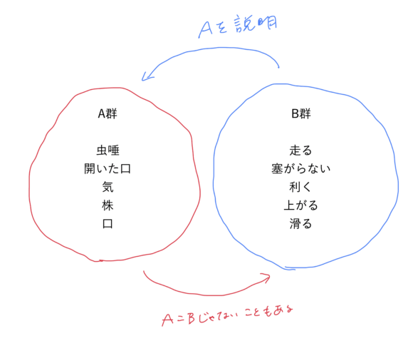 「は」の慣用句と決定的に違うのは、BがAの喩えではないことだ。Bは単にAの説明にすぎず、虫唾は走るときもあるし、走らないときもあるのでA=Bとはならない。開いた口、気、株についても同じだ。もしもことわざを一から作るとしたら、「AはB(Aの喩え)」か「AがB(Aの説明)」とすれば、それっぽい表現が作れると言える。