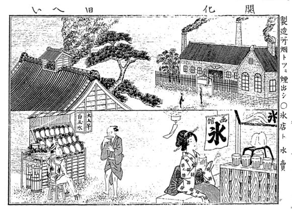 かき氷屋の前身となる氷水屋が生まれたのは明治初期(1878年)。それまで高級品だった氷が庶民のあいだにも出回るようになったころです。なかには粗悪な品質の氷もあり、当時の内務省は氷販売に衛生検査を導入。店頭に「官許」「氷」の文字のほか「凾舘」などと産地表示をした旗を掲げることを義務づけました。つまり、氷旗はもともとお店側の発案でできたものではなく、氷の品質が保証されていることを示すお上から指示だったんですね。